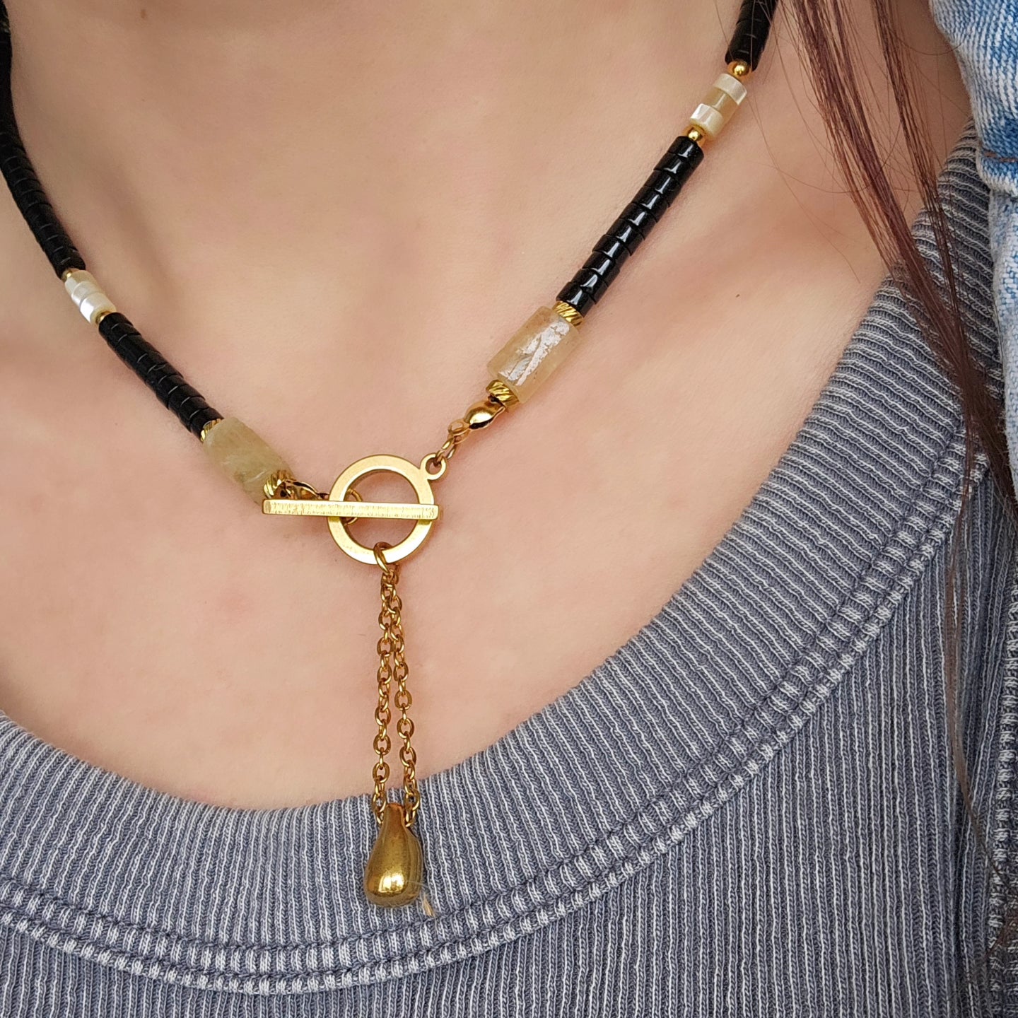 Handmade, stylish, modern, elegant necklace, Yellow Citrine , Black Agate stones , Shell beads, Toggle clasp, Stainless steel, Water drop pendant