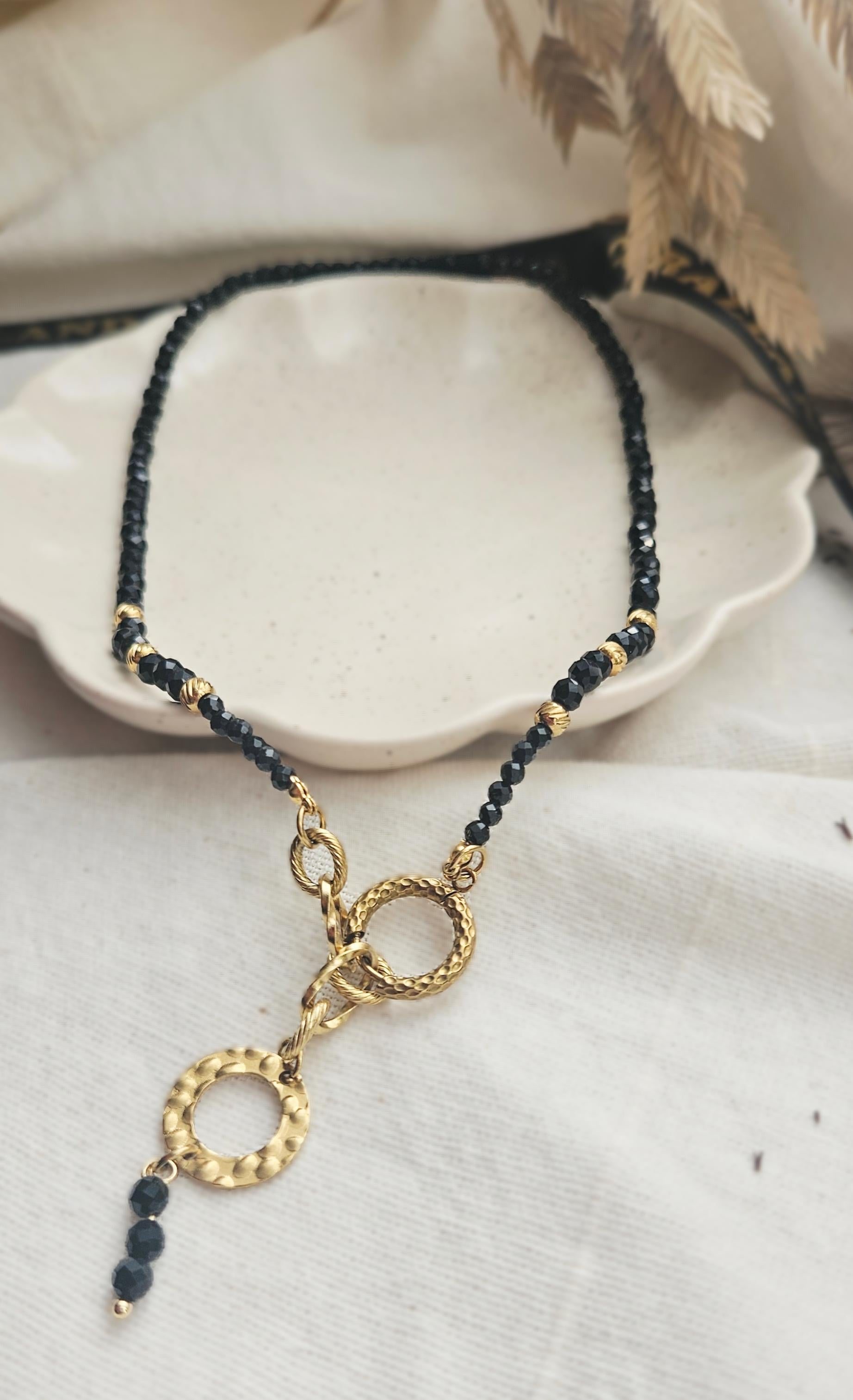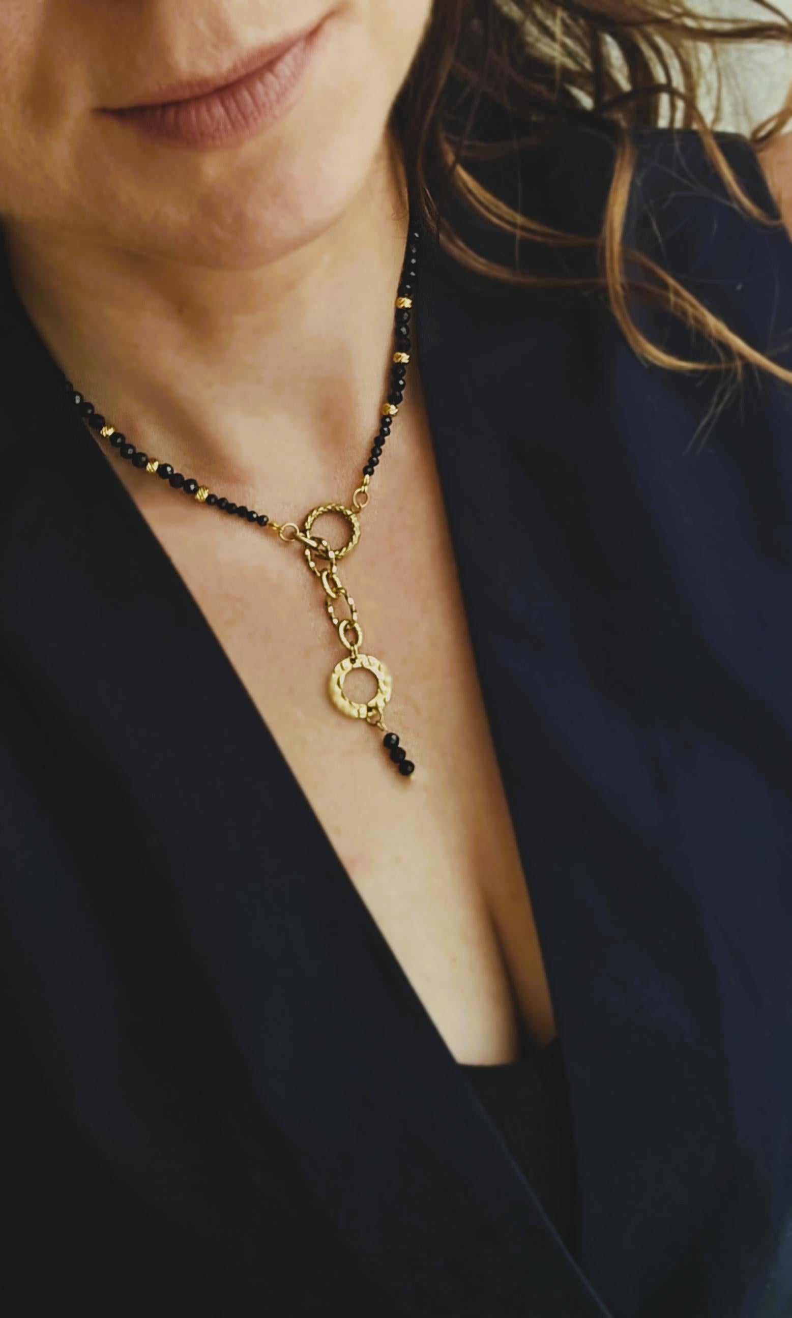The NEGRO POSITIVO handamade choker combines black tourmaline with stainless steel in a simple, elegant design. It can be worn three different ways and has an adjustable chain for the perfect fit.